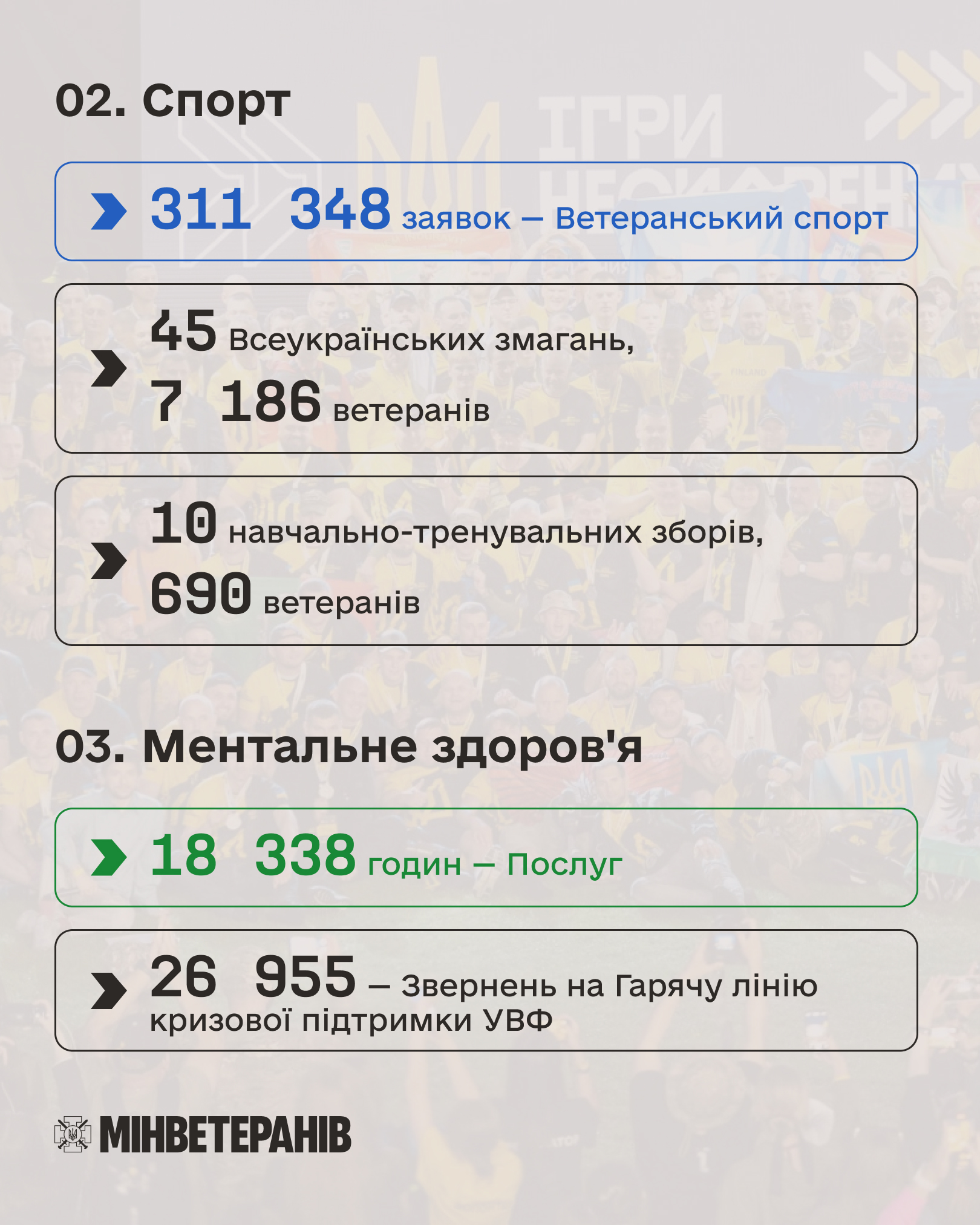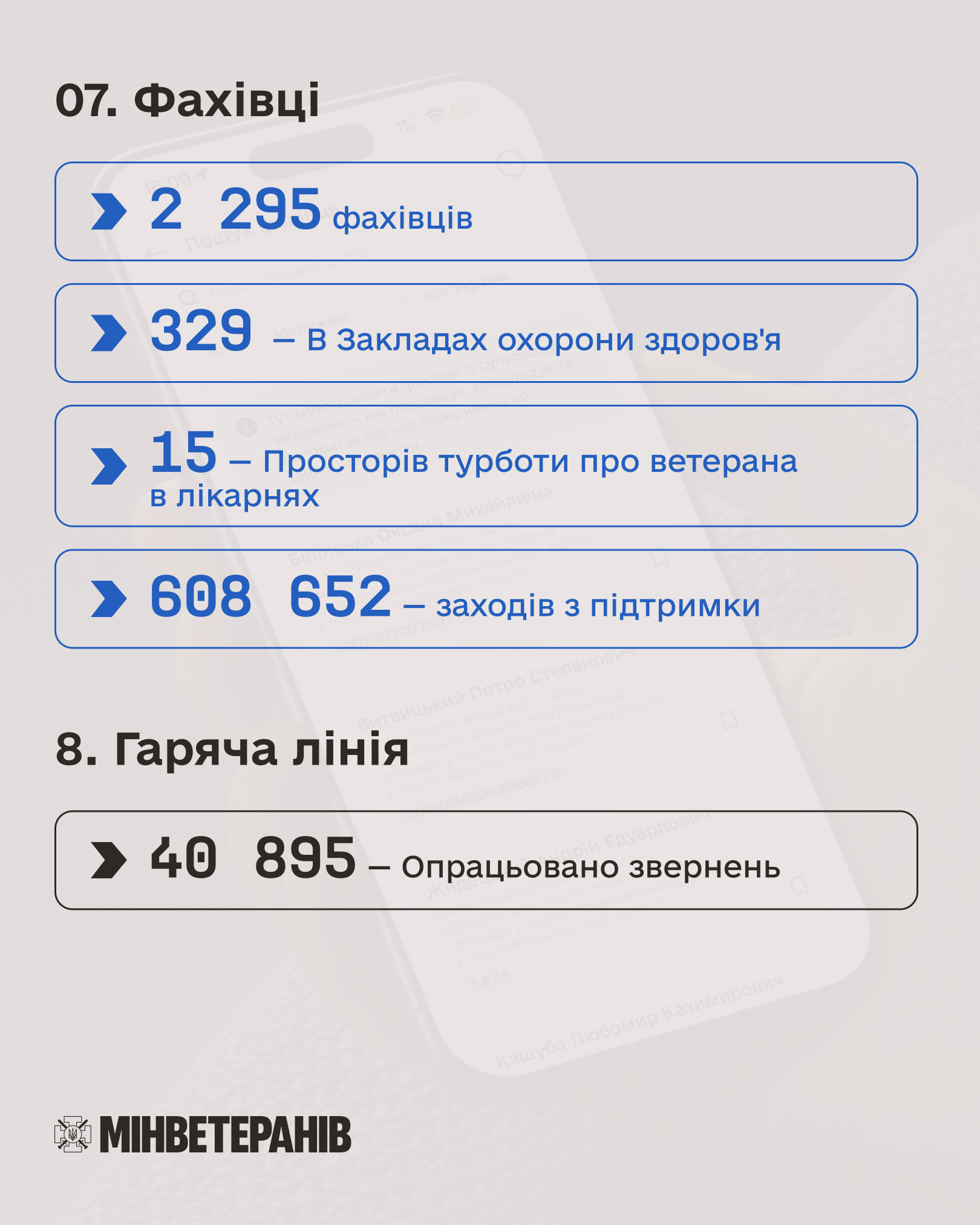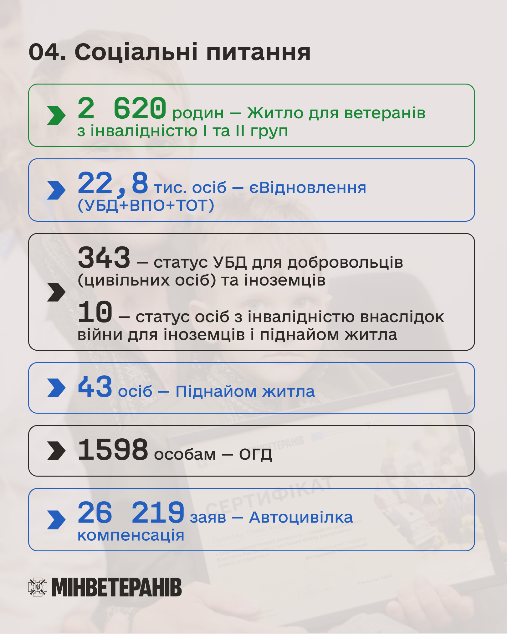 Здоров’я й відновлення. Житло. Ветеранський спорт. Фахівці із супроводу. Ментальна підтримка. Освіта. Робота. Власні справи. Цифровізація. Допомога родинам.