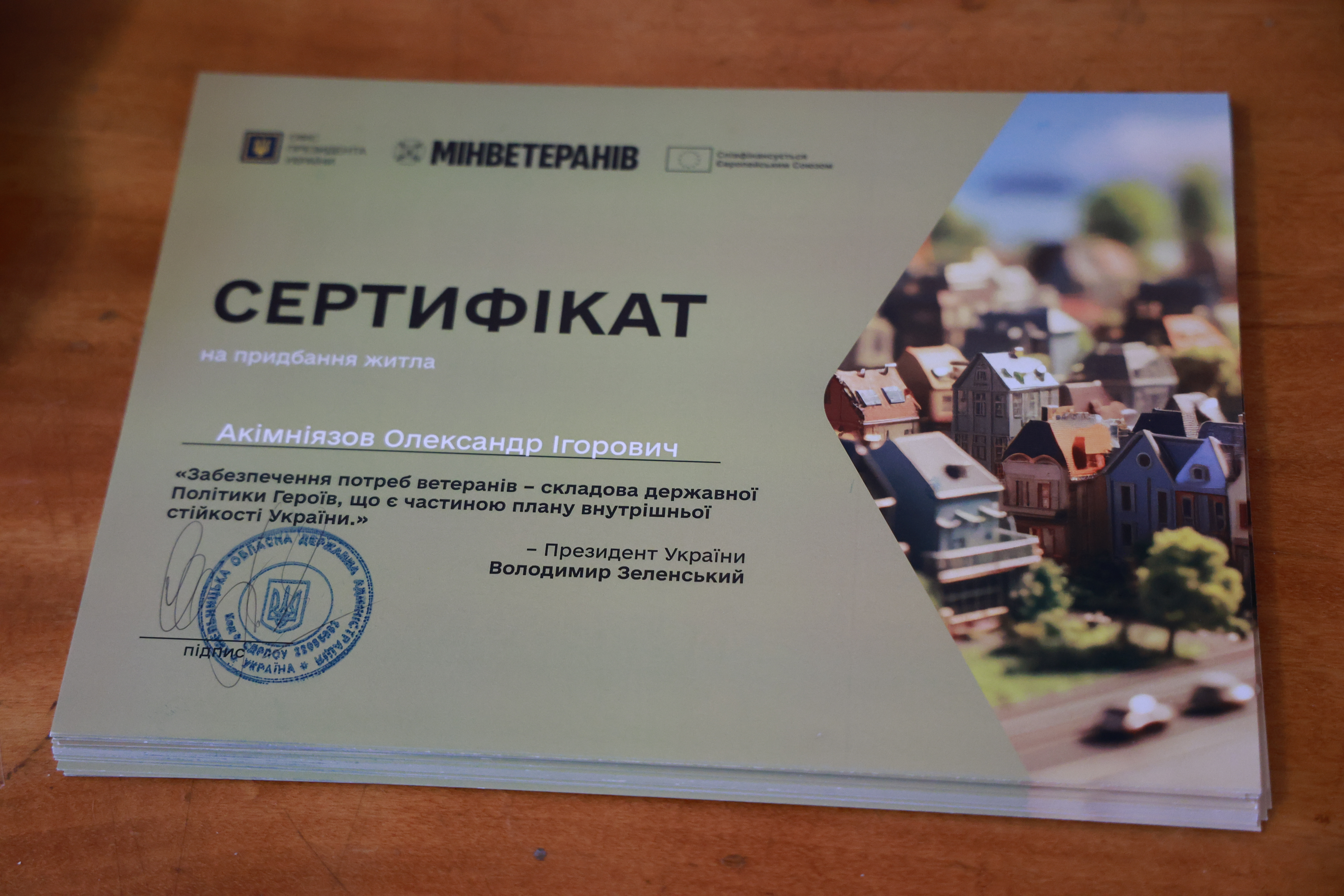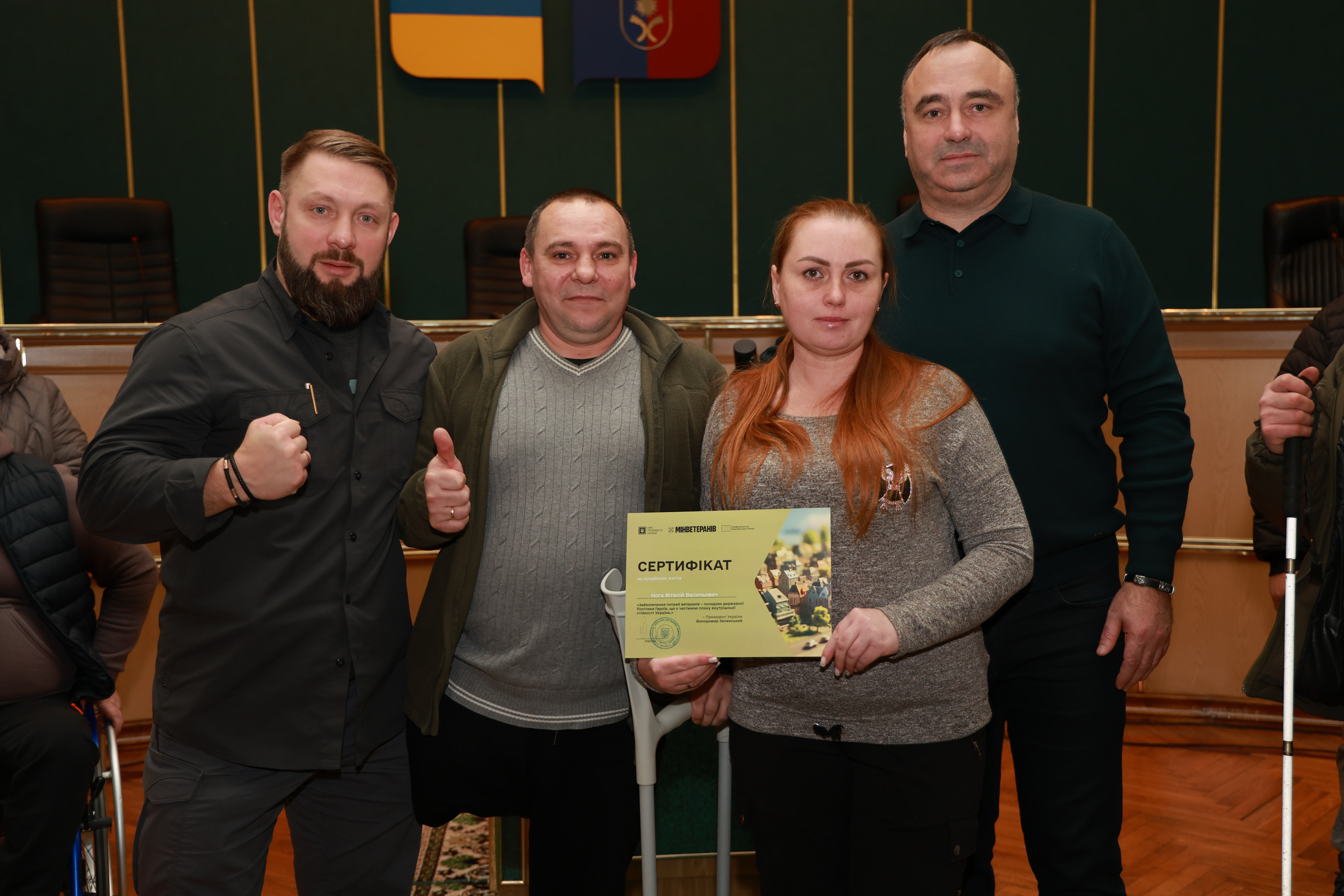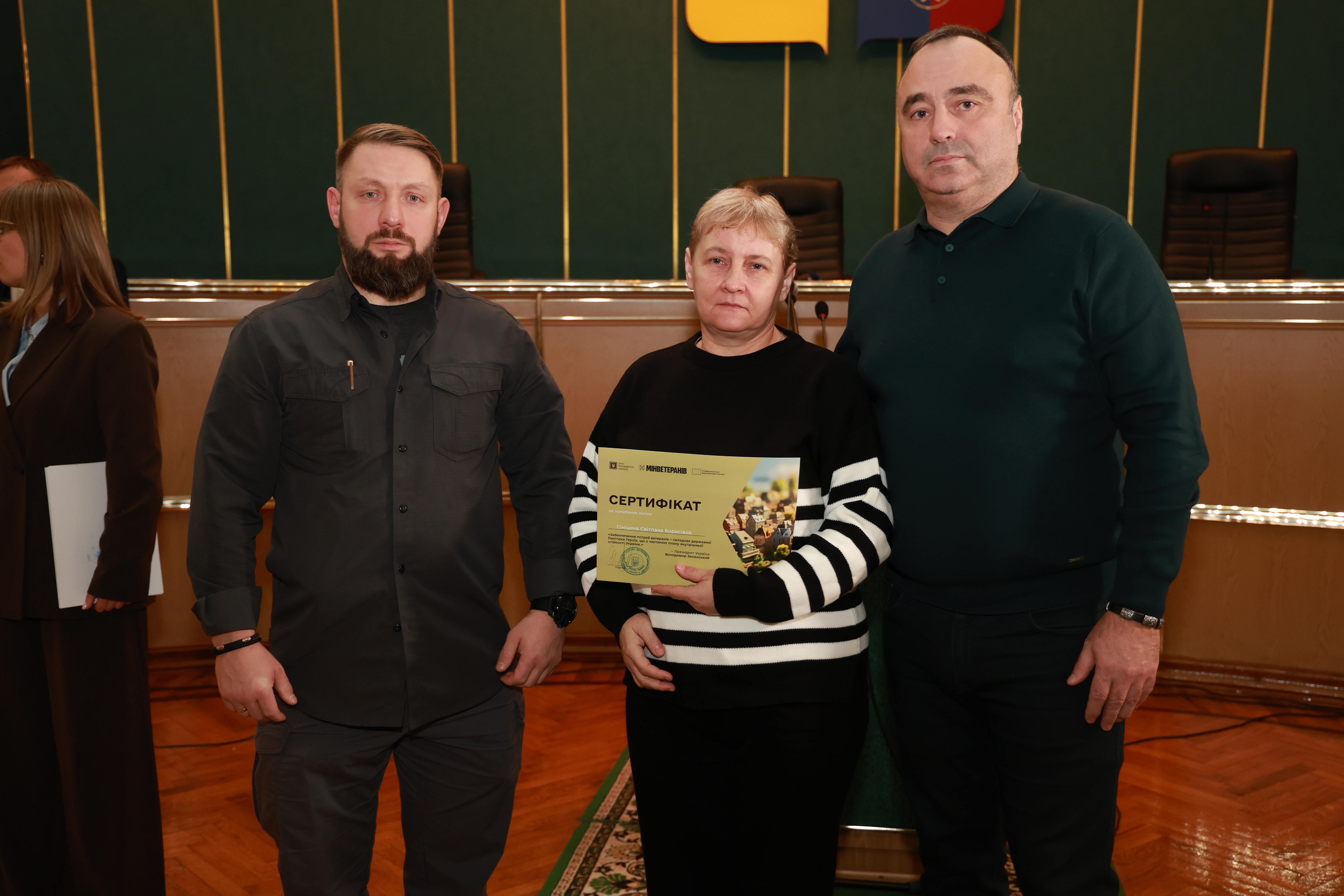 Вручення сертифікатів на житло стало можливим завдяки Президенту України Володимиру Зеленському, Кабінету Міністрів України, Міністерству у справах ветеранів України за фінансової підтримки Європейського Союзу в рамках реалізації інструменту Ukraine Facility.